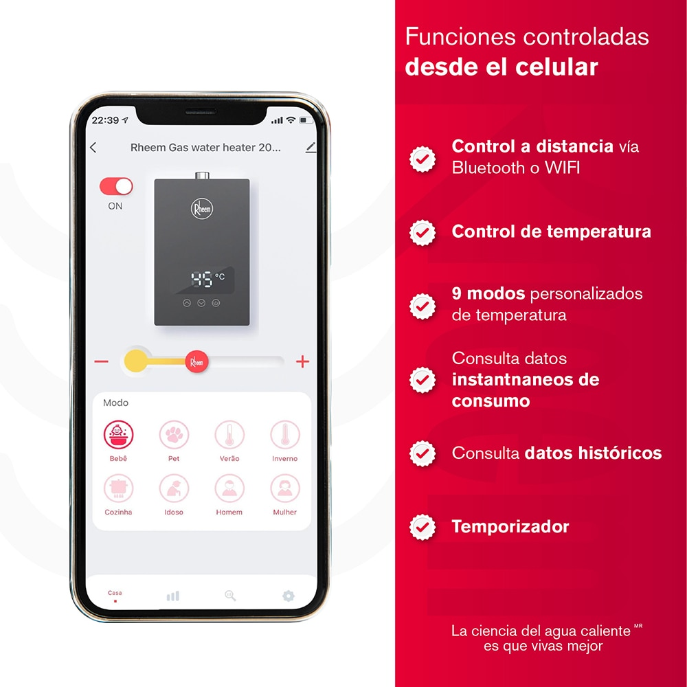Disfruta agua caliente al instante con control total desde tu celular. El calentador Rheem 16L WiFi combina potencia, eficiencia y tecnología para hasta 3 servicios simultáneos, brindando confort, seguridad y ahorro en cada uso.